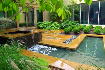 在這個(gè)小別墅花園的中間,水流從特制的銅碗流出,與L形狀的水池匯聚到一起。周邊的植物分別是黃楊木、玉簪花、白銀蓮花、黑竹以及草本植物。