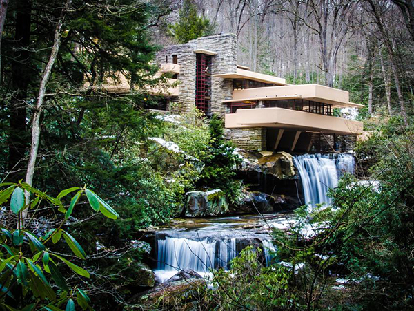 流水別墅是賴特為考夫曼家族設計的別墅。在瀑布之上,賴特實現了“方山之宅”(house on the mesa)的夢想,懸的樓板錨固在后面的和自然山石中。主要的一層幾乎是一個完整的大房間,通過空間處理而形成相互流通的各種從屬空間,并且有小梯與下面的水池聯系。正面在窗臺與天棚之間,是一金屬窗框的大玻璃,虛實對比十分強烈。整個構思是大膽的,成為無與倫比的世界最著名的現代建筑。