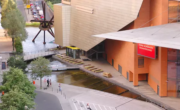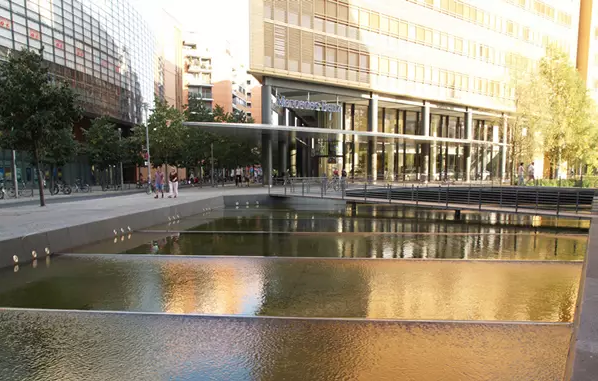 標志性的波茨坦廣場承載著東、西柏林分裂而遺留的歷史創(chuàng)傷。如薄沙般淺淺的流動臺階在微風拂動下,形成波光粼粼的韻律表面,為人們提供更多的親水、戲水樂趣。