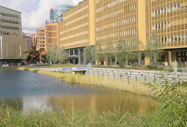 綠化屋頂和非綠化屋頂?shù)慕Y合設計可以獲取全年降雨量。雨水從建筑屋頂流下,作為沖廁、灌溉和消防用水。過量的雨水則可以流入戶外水景的水池和水渠之中,為城市生活增色添彩。植被凈化群落融入到整個景觀設計之中用以過濾和循環(huán)流經(jīng)街道和步道的水質、水體,而無任何化學凈水制劑的使用。湖水水質很好,為動植物創(chuàng)造了一個自然的棲息場所。同時,由于凈化雨水的再利用,也使得建筑內(nèi)部凈水使用量得以減少。在這里,城市生活、杰出的建筑創(chuàng)作和魅力的水景實現(xiàn)了和諧統(tǒng)一。