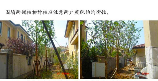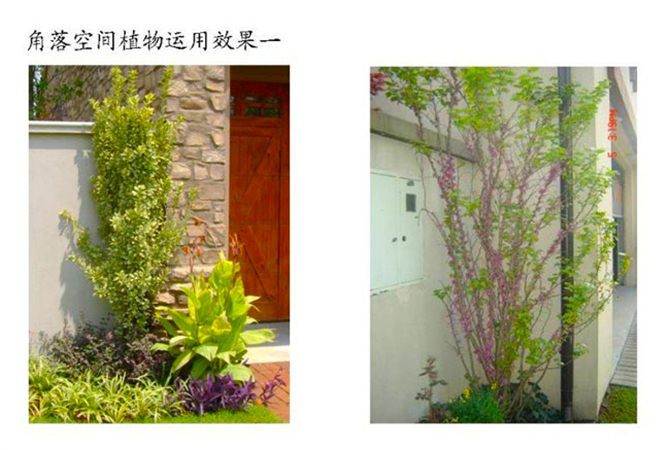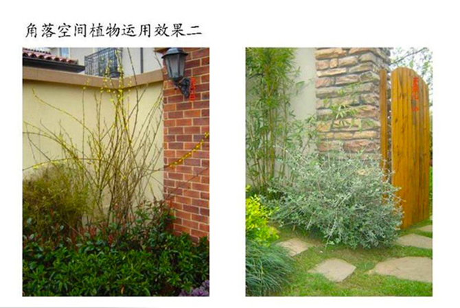 圍墻兩側(cè)植物種植就注意兩戶庭院的均衡性,一戶喬木過多,另處一戶只要簡單的樹木就可以了。側(cè)院入口選擇藤蔓植物,增強(qiáng)了入口的視覺效果。側(cè)院灌木應(yīng)突出層次和色相上的變化,品種選擇此宜過多,應(yīng)該遵循“簡單、干凈”的原則,營造一個(gè)令人愉悅的空間。在庭院的不同空間中設(shè)置不同種類的頂面和垂直面,從而加強(qiáng)空間的特性。庭院圍墻邊,要求保證私密性,一般選擇常綠與落葉喬木相搭配。