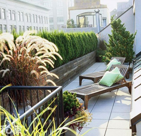 在狹長型的露臺旁設(shè)計(jì)一排低矮的綠色植物,平行擺放上兩把躺椅,即使是小空間也能盡享那一份寧靜與舒適。兩個綠色的靠墊則和綠色植物交相呼應(yīng)。