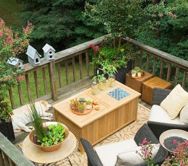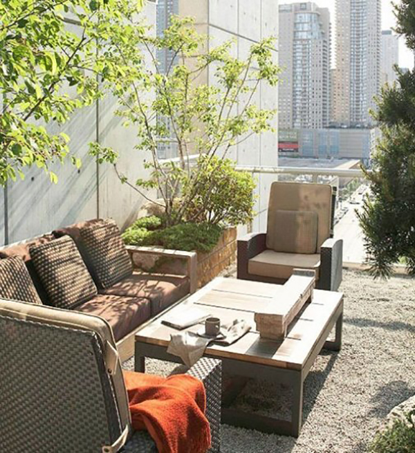 簡單的往往是更好的,選用一個長條形的木質(zhì)花盆,種上青青的綠竹,用玻璃作為圍欄,使這個空間自然形成了一個遮蔭處。擺放上兩把椅子,即使陽光強(qiáng)烈的時候也能感受那份愜意與溫馨。
