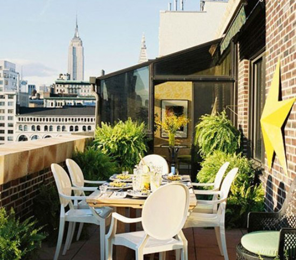 這個屋頂?shù)穆杜_以城市景觀為背景,四周擺放上綠色盆栽,中間則擺放上餐桌,讓你在用餐時也能欣賞著城市美景,感受自然的綠色。在墻面上的海星裝飾也十分別致。