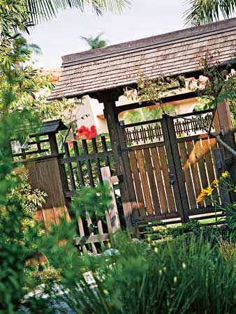 花園的大門設(shè)計別具匠心,木門木瓦的傳統(tǒng)樣式讓人在門外就感受到懷舊、質(zhì)樸的東方氣質(zhì)。將園門向院內(nèi)退入1米空間的設(shè)計,讓人感覺到庭院的幽深感,也為門口位置提供了更加充足的種植空間,豐富了花園的立面層次。園門配合四周的竹柵欄,阻隔一定的視線,更增加了花園的審美情趣。