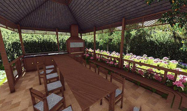 與前面幾款別墅庭院相比,第四款的設(shè)計(jì)要相對(duì)獨(dú)特一些。擺上桌椅,做了頂棚的待客區(qū)面積非常寬敞,在這樣區(qū)域中辦一個(gè)小型派對(duì)也完全沒(méi)有壓力。休閑區(qū)的四周被花卉?chē)@,坐在里面的人還能把這些美景納入眼睛,真是一個(gè)不錯(cuò)的視覺(jué)享受。一個(gè)頂棚的設(shè)計(jì),夏天遮陽(yáng),下雨天還能避雨,非常實(shí)用。試想一個(gè)下雨天坐在這里,看著外面的細(xì)雨與美景,任誰(shuí)也會(huì)被陶醉的吧。