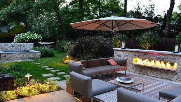 第三款別墅花園設(shè)計(jì)的也非常好看?;▓@中設(shè)計(jì)看了一個(gè)露天休閑區(qū),擺上舒適的沙發(fā),再搭配一把遮陽(yáng)傘,看著就非常自在。墻壁也不單調(diào),特意做了炭火的設(shè)計(jì),裝飾感十足。離開(kāi)休閑區(qū),花園更深處是一片青青草地,花卉與植物都非常茂盛,夏天在這樣的院子中散步,應(yīng)該會(huì)非常涼爽吧。