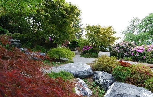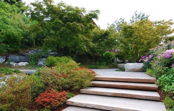 不同品種的日本楓樹創(chuàng)造了葉子形狀,葉子顏色和秋天著色的多樣性。用竹子種植的框架與開花的杜鵑花和杜鵑花相輔相成。草,苔蘚,蕨類植物和葬禮完成種植。砂巖碗里的紅豆杉盆景在花園的背景中提供了一個有價值的觀點。