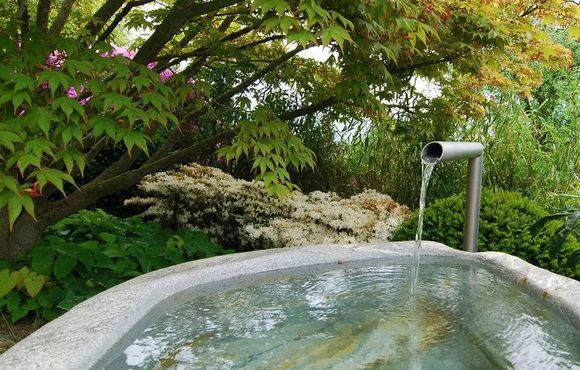 干燥的小溪從房屋頂部蜿蜒流向座位。它的花朵以純白色調(diào)綻放,象征著水。關(guān)于一個巨大的,形成野生木樓梯,你進入上面的花園院子里。從外面看不到庭院,但仍然可以欣賞到山谷的景色。礫石處提供放松和平靜的空間。竹葉在風(fēng)中的沙沙作響和噴泉的微妙飛濺完成了花園的畫面。