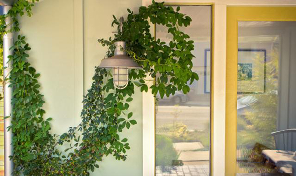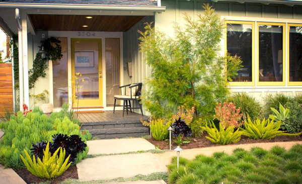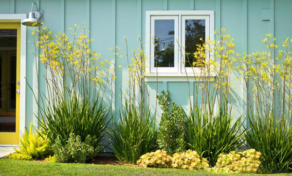 房子旁邊生長(zhǎng)著淡綠色的葛縷梅葉,下面種植著明亮的黃綠色狐尾蕨類植物,它們的葉子上點(diǎn)綴著石灰金色的門窗裝飾。窄葉藍(lán)色粉筆棒和銀色地毯種植在澆筑的混凝土鋪路機(jī)之間,與藍(lán)綠色外墻涂料有關(guān)。深紫色的多肉植物和火熱增添了興趣和多樣性。