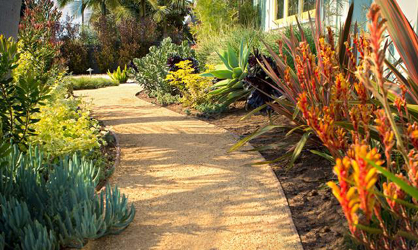 mark延續(xù)了前院的種植主題,用耐旱的多年生植物和五顏六色的多肉植物作為邊界。車庫(kù)新刷成藍(lán)綠色的一面作為袋鼠爪子黃色花朵尖刺的背景,前面是狐尾蕨類植物。