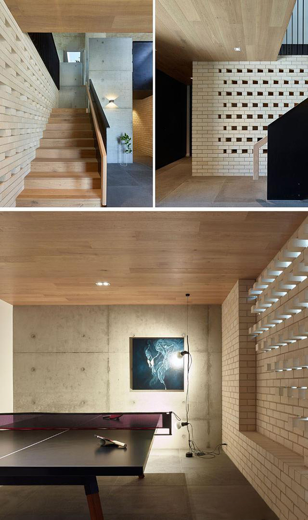 回到我們的用餐區(qū)后面,有一些個(gè)性設(shè)計(jì)的白色磚墻,旁邊有個(gè)木制樓梯,通向前門,車庫(kù)和游戲室。