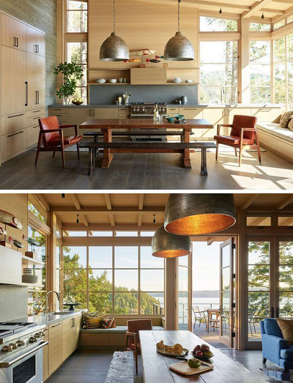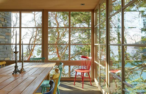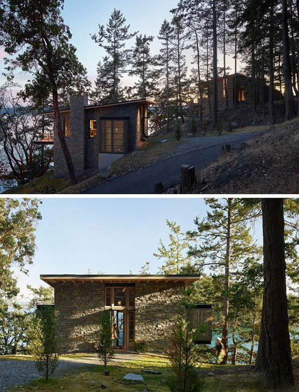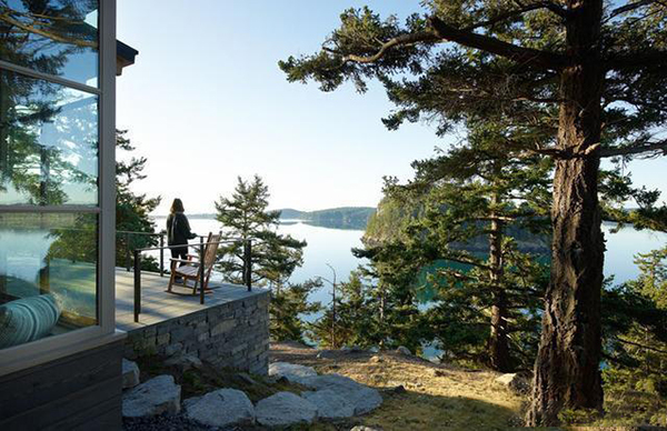 建筑師設(shè)計了一個主屋和一個副旅館小屋,充分利用華盛頓州普吉特海灣的自然景色,可以一覽無余的眼前的美景,主屋位于一個高聳的山坡上的小高原上。