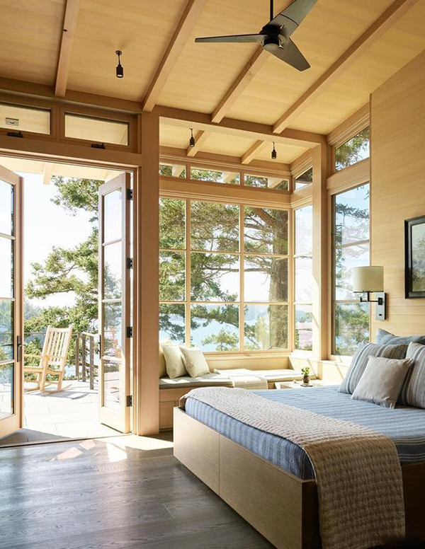 主屋的主臥室采用與廚房相似的設(shè)計,配有靠窗的座位,相當于現(xiàn)在人們喜歡的飄窗設(shè)計,高傾斜的天花板和通往室外的跳臺甲板的通道。