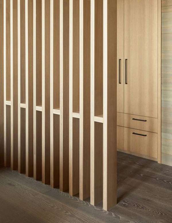 主臥室還設(shè)有簡約的現(xiàn)代化客房隔斷,將衣柜與睡眠區(qū)隔開。原木式的柵欄設(shè)計于整個臥室的裝修主色調(diào)保持在同一個色系上,使得整個空間更加的統(tǒng)一美觀。