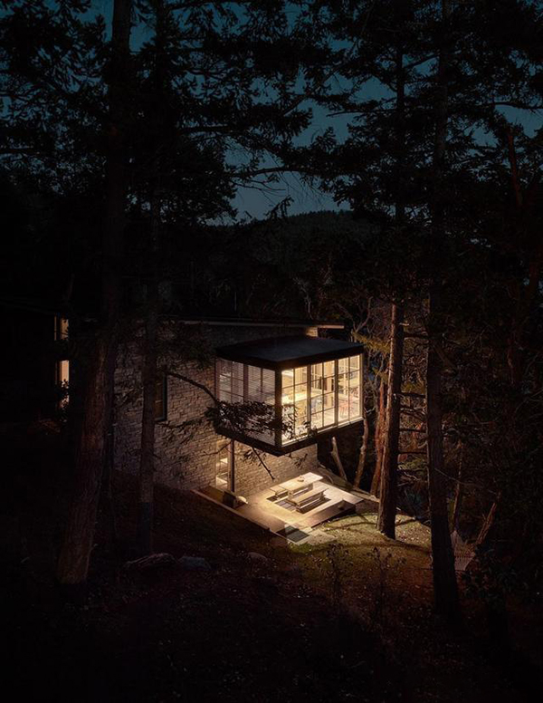 旅館小屋設(shè)有一個餐廳,設(shè)計為漂浮在樹林中的三面玻璃物體。在餐廳下方,有一個露天用餐區(qū),從上面懸臂式餐廳的燈光照亮。