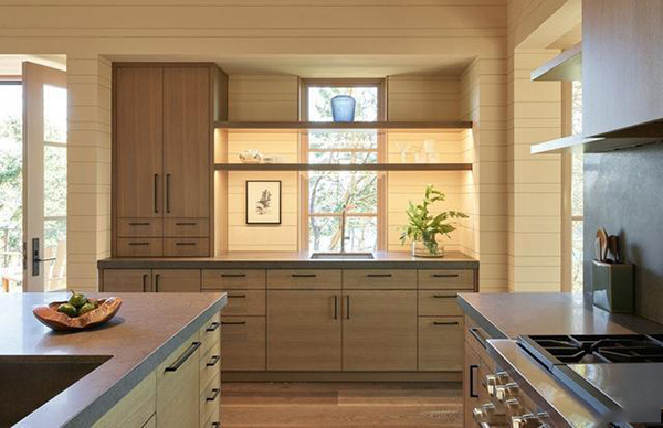 小屋的廚房擁有簡約而自然的淺色木質(zhì)和灰色臺面混合使用。廚房的設(shè)計為環(huán)繞型態(tài),三角區(qū)域互不干擾確保每個功能系統(tǒng)的正常使用。