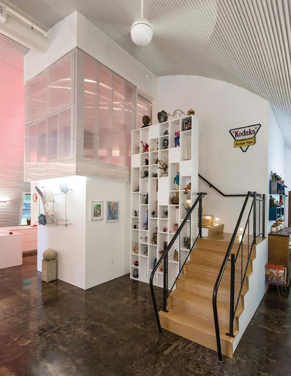 樓梯,閣樓和百葉窗聚碳酸酯窗戶讓我們體驗到高大的層高空間。樓梯上的黑色鋼欄桿與白色環(huán)境形成鮮明對比。