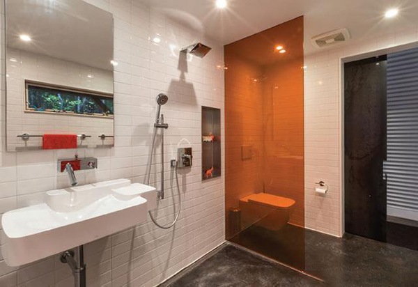 隱藏在廚房后面的是其中一間浴室和一間臥室。浴室的整個內部都可以看到,干濕分離用的是帶有輻射加熱的彩色混凝土地板。