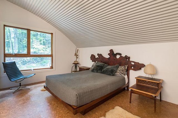 樓上是主臥室的所在地,設有樹頂景觀窗戶,由于小屋的形狀,還設有弧形天花板。