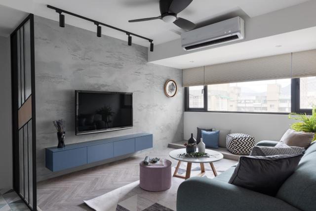 客廳中的布置真的超簡單,干凈利索又很整潔,軟裝的搭配精致小巧,非常小清新,很有生活的氣息??蛷d里比較特別的設(shè)計(jì)應(yīng)該是電視墻,灰色的水泥效果彰顯了個(gè)性和質(zhì)感,很有范兒,搭配藍(lán)色的懸空電視柜真的超耐看。兩居室的客廳比較小,所以用的是壁掛式空調(diào),這樣也比較節(jié)省空間,除了空調(diào),客廳還安裝了吊扇,而且吊扇也是客廳燈,有兩用的效果,這樣就能享受自然風(fēng)了。
