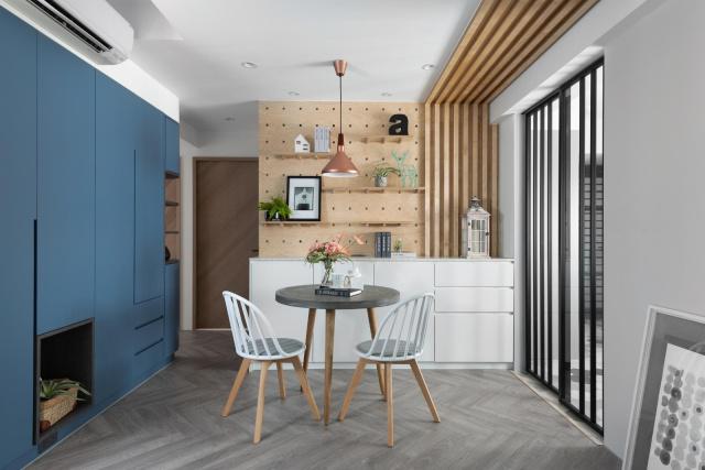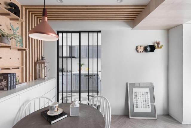 餐廳的設(shè)計(jì)小巧精致,因?yàn)椴蛷d空間有限,所以用了小圓桌,這樣非常節(jié)省空間,而且又實(shí)用,餐廳里還設(shè)計(jì)了餐邊柜,白色的地柜搭配原木色裝飾架,讓這個(gè)小空間清新又漂亮。餐廳的右側(cè)就是廚房,采用了黑色邊框的玻璃推拉門,與白色墻壁搭配簡單又漂亮。