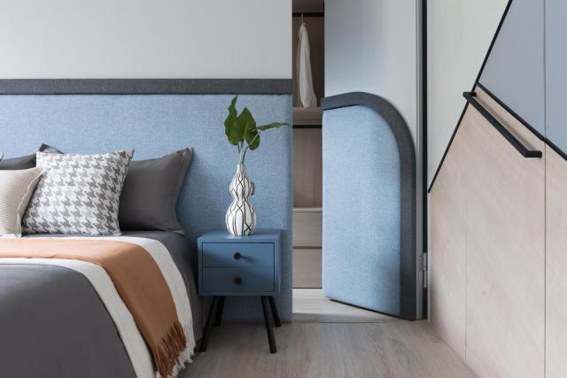 次臥的空間比較小,但也結(jié)合墻體做了收納衣柜,實(shí)用功能也還不錯(cuò),并且衣柜上還安裝了電視,實(shí)用又休閑。次臥的床頭墻特別好看,使用了彩色的軟包,靠在上面很舒服,藍(lán)色的裝飾效果讓次臥清新又精致。朋友的新房裝修真漂亮!尤其臥室的隱形門設(shè)計(jì),耐看又實(shí)用,超贊