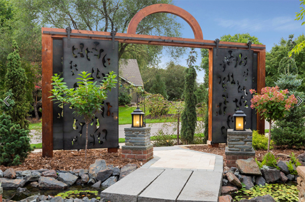 這個(gè)花園的面積不小,設(shè)計(jì)的很有層次感,多種景致搭配在一起,讓花園里有了多個(gè)空間的感覺,花園里大面積的應(yīng)用了石材和防腐木,搭配了大面積的植物作物輔助裝飾,整個(gè)花園簡約而不失單調(diào),色彩配比合理美觀,搭配和諧有度,花園中最大的特色和亮點(diǎn)莫過于水中的休息平臺,采用了防腐木的材質(zhì)在水中搭建了防腐木地臺,上面擺放了防水材質(zhì)的沙發(fā),再鋪上幾個(gè)墊子,就可以無憂的享受大自然的饋贈(zèng)了,花園里的另一個(gè)特點(diǎn)就是大門,大門采用了鐵藝雕花,滑道設(shè)計(jì)手法,整體看上去非常的精致美觀。