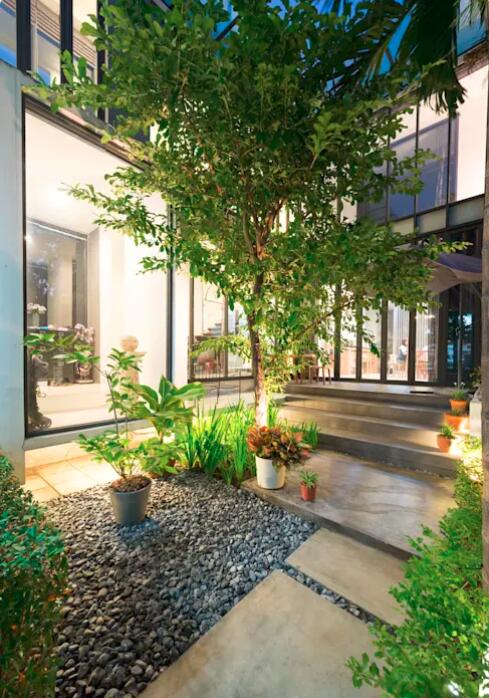 混凝土的地面和高大的植物,融合出貼近自然的風(fēng)情,搭配石塊造景,美出新的層次
