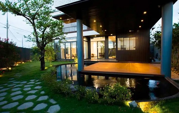 傍著住家延伸出來的有頂蓋露臺,讓你的庭院成為起居的延伸,橫跨水池之上,有種在水一方的幽然