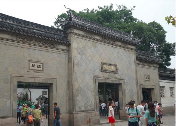 此花壇內(nèi)石碑是紀(jì)念登錄“世界文化遣產(chǎn)”, 其兩側(cè)為圓形洞門,是游客出入拙政園的通道,上有磚刻門額兩塊,左為“入勝”,右為“通幽”,引人無限期待。
