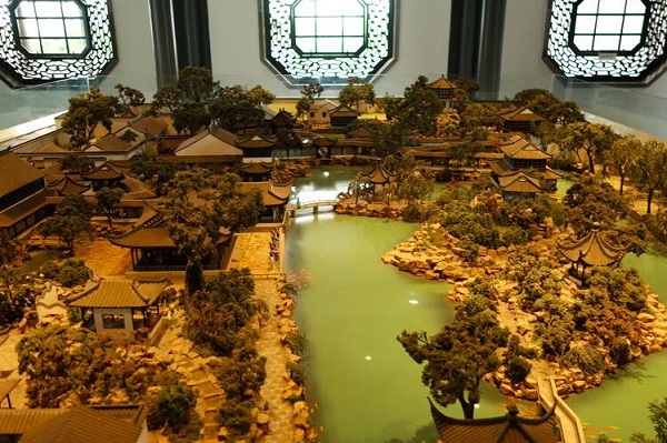 拙政園中現(xiàn)有的建筑,大多是清咸豐九年拙政園成為太平天國(guó)忠王府花園時(shí)重建。拙政園布局主題以水為中心,池水面積約占總面積的五分之一,各種亭臺(tái)軒榭多臨水而筑,園區(qū)可分為東園、西園和中園三個(gè)部分,以下將逐一游覽,下圖為中園的縮小模型(拍攝于隔壁的”蘇州園林博物館”)。