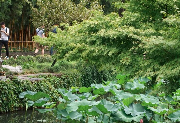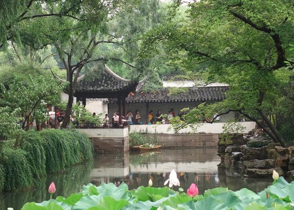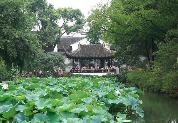 拙政園的布局疏密自然,其特點(diǎn)是以水為主,夏日時(shí)點(diǎn)綴著荷花及各種植栽,充滿綠意,景色自然疏朗,下圖即為一例,遠(yuǎn)方一隅為小巧的“綠綺亭”。