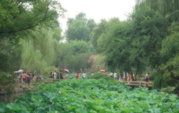 荷風(fēng)四面亭亭中有對(duì)聯(lián):“四面荷花三面柳,半潭秋水一房山”, 用在此處十分貼切,夏季荷花與楊柳處處。