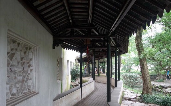 倒影樓旁的波形長(zhǎng)廊,借墻為廊,凌水而建,將廊的下部架空,猶如樓道一般,依水勢(shì)作成高低起伏、彎轉(zhuǎn)曲折狀,使景觀空間富于彈性,具有韻律美和節(jié)奏美。其水中倒影靜謐、充滿綠意。