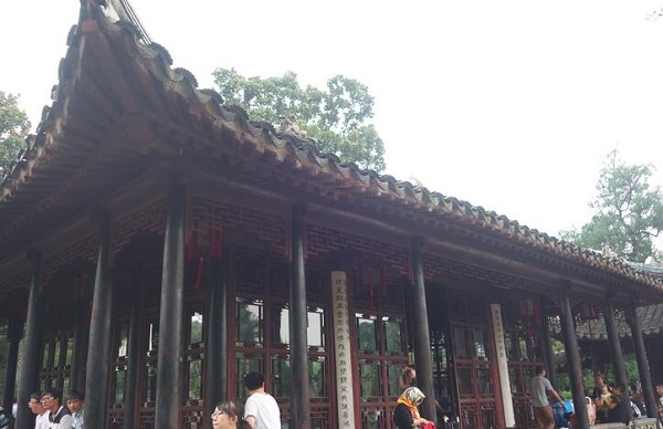 “倒影樓”是以觀賞水中倒影為主的景點(diǎn),上方照片就是從倒影樓看出去的風(fēng)景。樓分兩層,樓下是為“拜文揖沈之齋”,文是指文征明,沈是指沈周(石田)。中間裙板上刻有鄭板橋的書畫真跡。