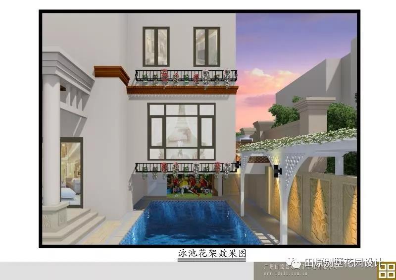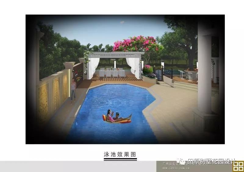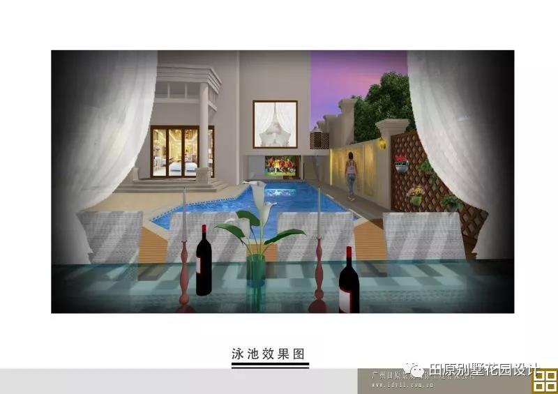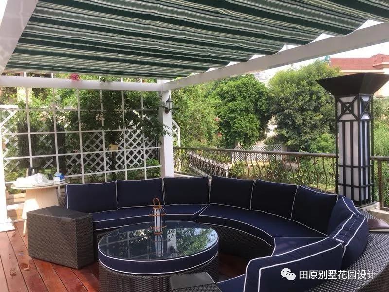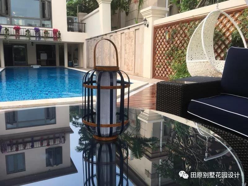 別墅花園泳池旁依建筑風(fēng)格而建的方形花架,內(nèi)設(shè)舒適沙發(fā)與茶幾將客廳移至室外,接待賓客于山水之間,感受自然回饋的自由與舒適,如身處水上天堂般令人身心放松與愉悅。設(shè)計(jì)師合理運(yùn)用周圍事物讓一切建筑都不顯得突兀,紅色的實(shí)木地板,配以頂棚別致的黑白線條,景致的遙相呼應(yīng)讓泳池不再孤立,整個(gè)休閑平臺(tái)顯得優(yōu)雅大方。遮陽(yáng)棚下,飲酒品茗、享受美食、休憩娛樂,設(shè)計(jì)師通過借景到自家后花園,將此處無(wú)限擴(kuò)大,彰顯出擁有者的巨大實(shí)力。