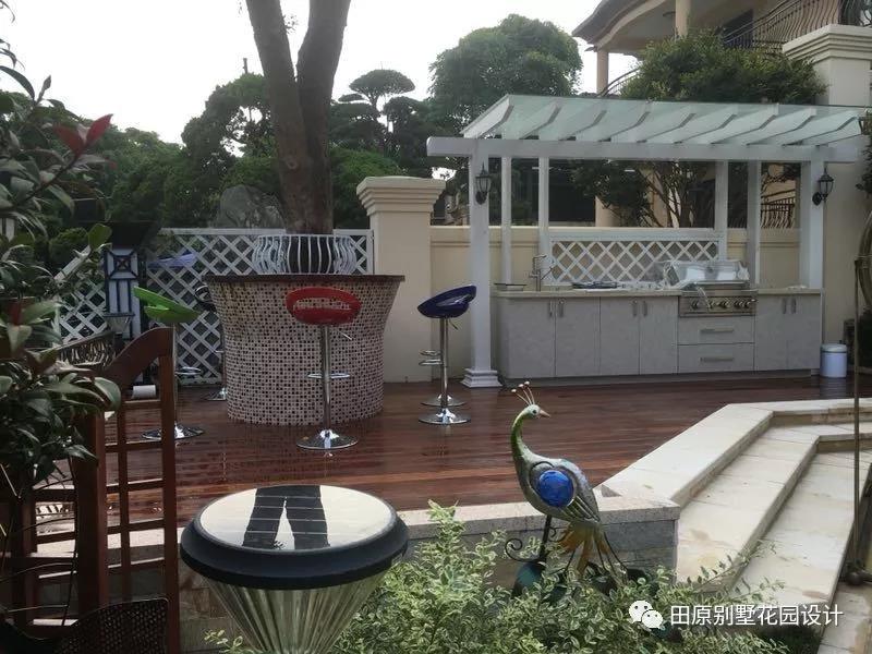 臺(tái)階旁邊,屹立著一只美麗的藍(lán)孔雀,樹下,院子臺(tái)階的轉(zhuǎn)角處是一個(gè)簡(jiǎn)潔而干凈的燒烤平臺(tái),放置休閑座椅,旁邊的盆栽正縱情綻放,背后是郁郁蔥蔥的大樹,綠色又環(huán)保,表現(xiàn)出園主視己與自然渾同一體。以觀遠(yuǎn)山近水,舒展胸懷,各有其妙,別墅花園每個(gè)空間都好好利用,既要有漂亮的景致,也要有實(shí)用價(jià)值。