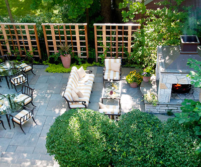 用石頭鋪設(shè)地板,可以讓你的庭院緩和、不突兀地過渡到庭院周圍的石徑——但為什么不設(shè)計(jì)并建造一個(gè)具有一定高度的石凳,為客人提供座位?因?yàn)楸跔t附近的的矮墻已為客人坐供應(yīng)了一個(gè)即興的現(xiàn)場座位了。