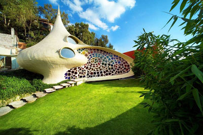 下面這座“鸚鵡螺”式的房屋位于墨西哥的Naucalpan,由建筑事務(wù)所設(shè)計(jì),建成于2006年,客戶是一對有兩個(gè)孩子的年輕夫婦。他們厭倦了傳統(tǒng)的住宅,希望能夠擁有一座融入大自然的住房。房子所在處的地勢向上,南邊、北邊和東邊都是高樓大廈,西邊則可以一覽廣闊的群山。經(jīng)過無數(shù)次修改后,形成了一個(gè)鸚鵡螺式的結(jié)構(gòu)。居住在其中似乎像蝸牛一樣,從一個(gè)房間緩慢移動到另一個(gè)房間,頗似共生的化石住所。住宅中沒有任何劃分,在三維的和諧空間中你會發(fā)現(xiàn)第四維的動感,從樓梯盤旋而下的時(shí)候感覺就像軟體動物趴在植被上。