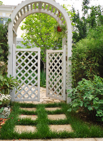 拱形別墅花園門可以為攀爬的植物提供載體,白色的拱門上可以是浪漫的紫藤、嬌艷的月季、熱烈的凌霄、多姿的鐵線蓮。無論是哪種植物都會(huì)讓你的花園更具立體感。