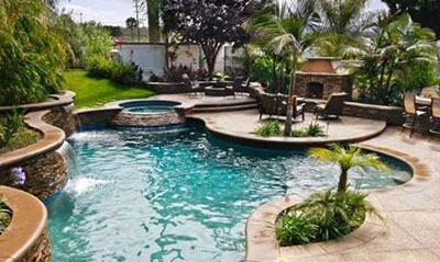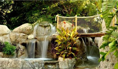 游泳池是熱帶景觀中常會(huì)有的設(shè)備,造型多樣,自然造型的如同在熱帶雨林或叢林中偶然發(fā)現(xiàn)的水池,而實(shí)際上這種游泳池是用人造巖石建成,有時(shí)花園里還會(huì)有精巧的疊石理水:瀑布、跳巖、水滑道等。游泳池的內(nèi)部常用色彩明亮的石材鋪裝,可以加強(qiáng)整個(gè)庭院的色彩表現(xiàn)。