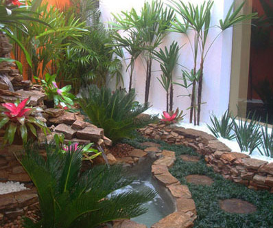 由假山和植物構(gòu)建而成的園林,給人帶來了熱帶雨林的感覺,鮮艷的花朵搭配濃濃的綠,好一幅絕美景致。