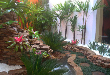 由假山和植物構(gòu)建而成的園林,給人帶來了熱帶雨林的感覺,鮮艷的花朵搭配濃濃的綠,好一幅絕美景致。